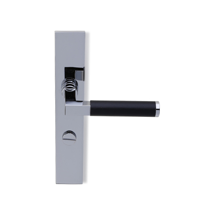 Bekende deurkrukken in Bauhaus stijl. Idem als op haaks blind geveerd schild, maar dan met een toilet/badkamersluiting, afstand midden krukgat tot midden slot, stift 8mm. Wegens het ebbenhout niet geschikt voor buitengebruik.