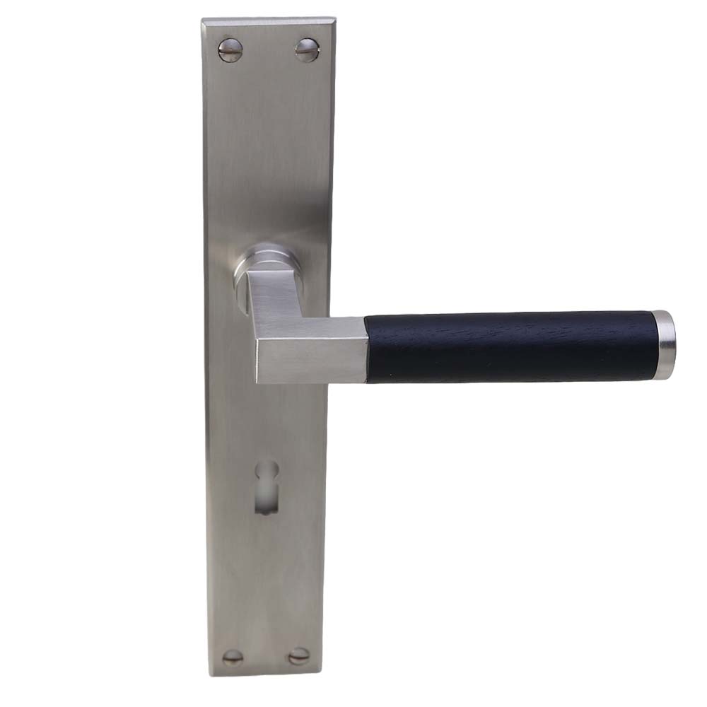 Bekende deurkrukken in Bauhaus stijl. Idem als op Bauhaus schild blind maar dan met een sleuteluitsparing, afstand midden krukgat tot midden sleutelgat. Wegens het ebbenhout niet geschikt voor buitengebruik.