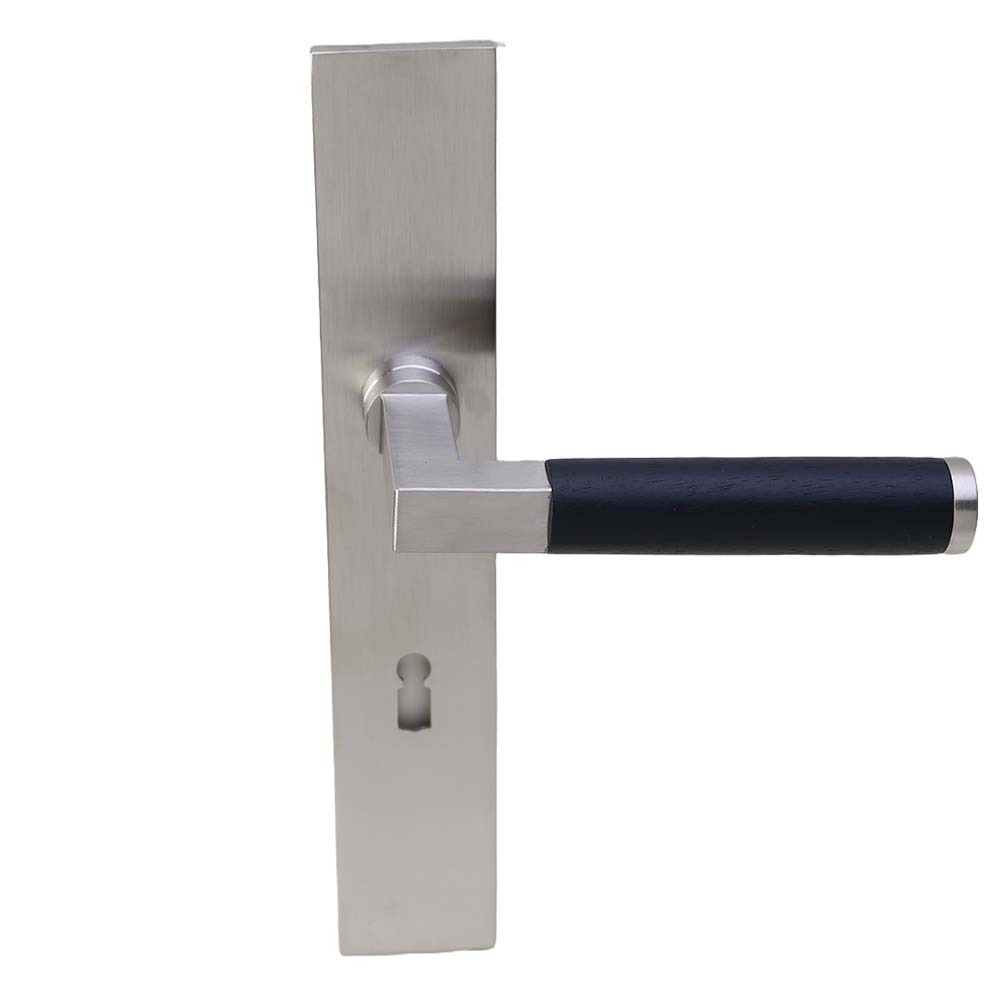 Bekende deurkrukken in Bauhaus stijl. Idem als op haaks blind geveerd schild maar dan met een sleuteluitsparing, afstand midden krukgat tot midden sleutelgat. Wegens het ebbenhout niet geschikt voor buitengebruik.