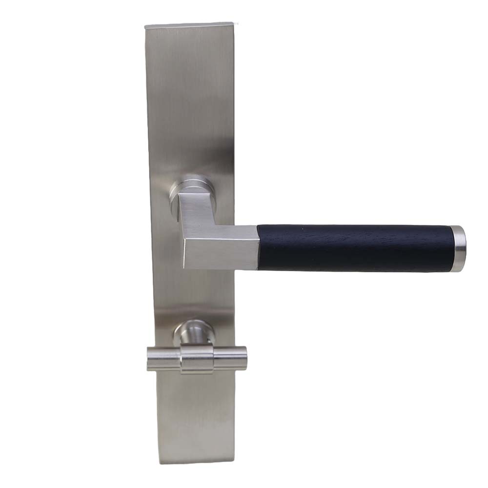 Bekende deurkrukken in Bauhaus stijl. Idem als op haaks blind geveerd schild, maar dan met een toilet/badkamersluiting, afstand midden krukgat tot midden slot, stift 8mm. Wegens het ebbenhout niet geschikt voor buitengebruik.