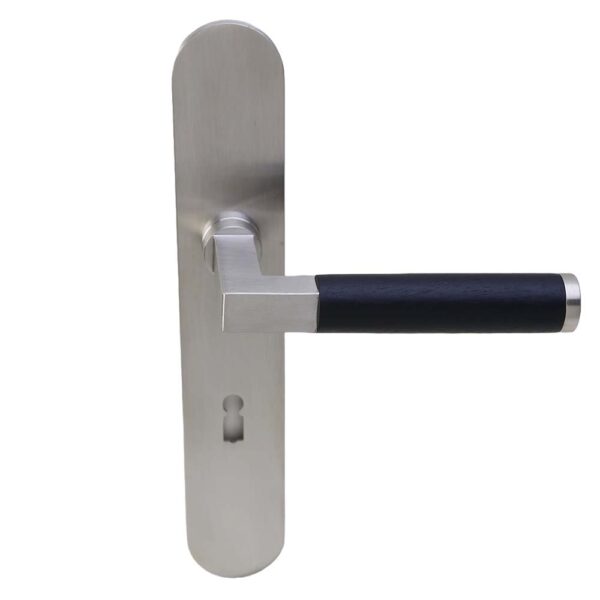 Bekende deurkrukken in Bauhaus stijl. Idem als op ovaal blind geveerd schild maar dan met een sleuteluitsparing, afstand midden krukgat tot midden sleutelgat. Wegens het ebbenhout niet geschikt voor buitengebruik.