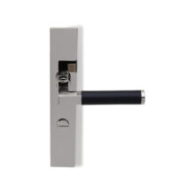 Bekende deurkrukken in Bauhaus stijl. Idem als op haaks blind geveerd schild, maar dan met een toilet/badkamersluiting, afstand midden krukgat tot midden slot, stift 8mm. Wegens het ebbenhout niet geschikt voor buitengebruik.