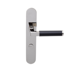 Bekende deurkrukken in Bauhaus stijl. Idem als op ovaal blind geveerd schild, maar dan met een toilet/badkamersluiting, afstand midden krukgat tot midden slot, stift 8mm. Wegens het ebbenhout niet geschikt voor buitengebruik.