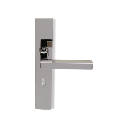 Strakke tijdloze deurkrukken. Idem als op haaks blind geveerd schild maar dan met een sleuteluitsparing, afstand midden krukgat tot midden sleutelgat.