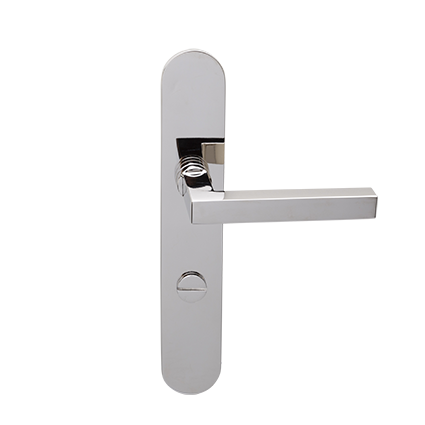 Strakke tijdloze deurkrukken. Idem als op ovaal blind geveerd schild, maar dan met een toilet/badkamersluiting, afstand midden krukgat tot midden slot, stift 8mm
