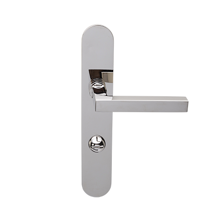 Strakke tijdloze deurkrukken. Idem als op ovaal blind geveerd schild, maar dan met een toilet/badkamersluiting, afstand midden krukgat tot midden slot, stift 8mm