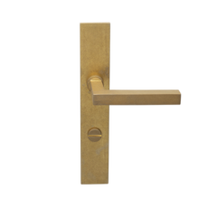 Strakke tijdloze deurkrukken. Idem als op haaks blind geveerd schild, maar dan met een toilet/badkamersluiting, afstand midden krukgat tot midden slot, stift 8mm