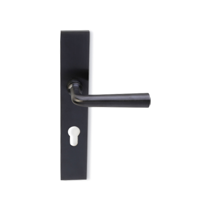Verfijnde deurkrukken in Bauhaus stijl. Idem als op haaks blind geveerd schild maar dan met een cilinderuitsparing, afstand midden krukgat tot midden cilindergat.