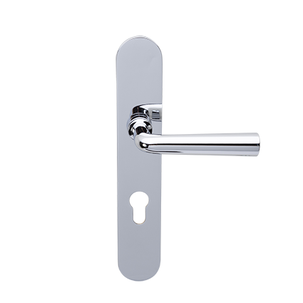 Deurkruk München chroom op ovaal geveerd schild met cilindergat