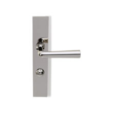 Verfijnde deurkrukken in Bauhaus stijl. Idem als op haaks blind geveerd schild, maar dan met een toilet/badkamersluiting, afstand midden krukgat tot midden slot, stift 8mm