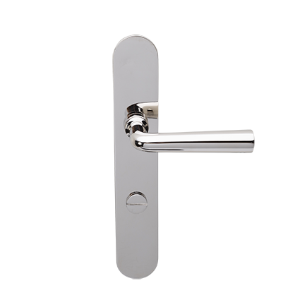 Verfijnde deurkrukken in Bauhaus stijl. Idem als op ovaal blind geveerd schild, maar dan met een toilet/badkamersluiting, afstand midden krukgat tot midden slot, stift 8mm