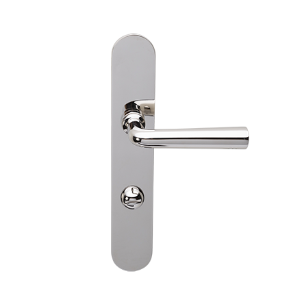 Verfijnde deurkrukken in Bauhaus stijl. Idem als op ovaal blind geveerd schild, maar dan met een toilet/badkamersluiting, afstand midden krukgat tot midden slot, stift 8mm
