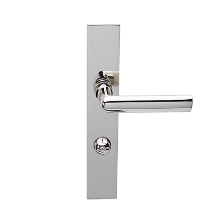 Robuuste deurkrukken van Hans Poelzig. Idem als op haaks blind geveerd schild, maar dan met een toilet/badkamersluiting, afstand midden krukgat tot midden slot, stift 8mm