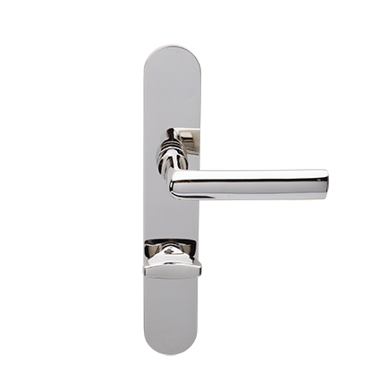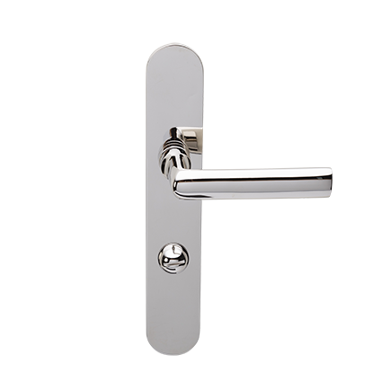 Robuuste deurkrukken van Hans Poelzig. Idem als op ovaal blind geveerd schild, maar dan met een toilet/badkamersluiting, afstand midden krukgat tot midden slot, stift 8mm