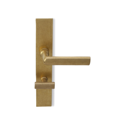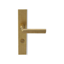 Robuuste deurkrukken van Hans Poelzig. Idem als op haaks blind geveerd schild, maar dan met een toilet/badkamersluiting, afstand midden krukgat tot midden slot, stift 8mm