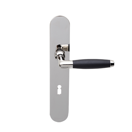 Deurkruk Ton nikkel/ebben op ovaal geveerd schild met sleutelgat