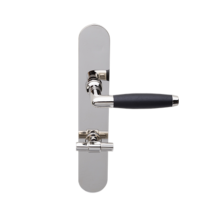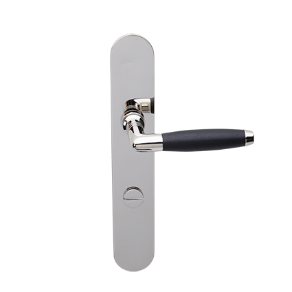 Bekende jaren 30 Ton model deurkrukken. Idem als op ovaal blind geveerd schild, maar dan met een toilet/badkamersluiting, afstand midden krukgat tot midden slot, stift 8mm. Wegens het ebbenhout niet geschikt voor buitengebruik.