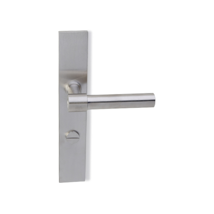 Idem als op haaks blind geveerd schild, maar dan met een toilet/badkamersluiting, afstand midden krukgat tot midden slot, stift 8mm.